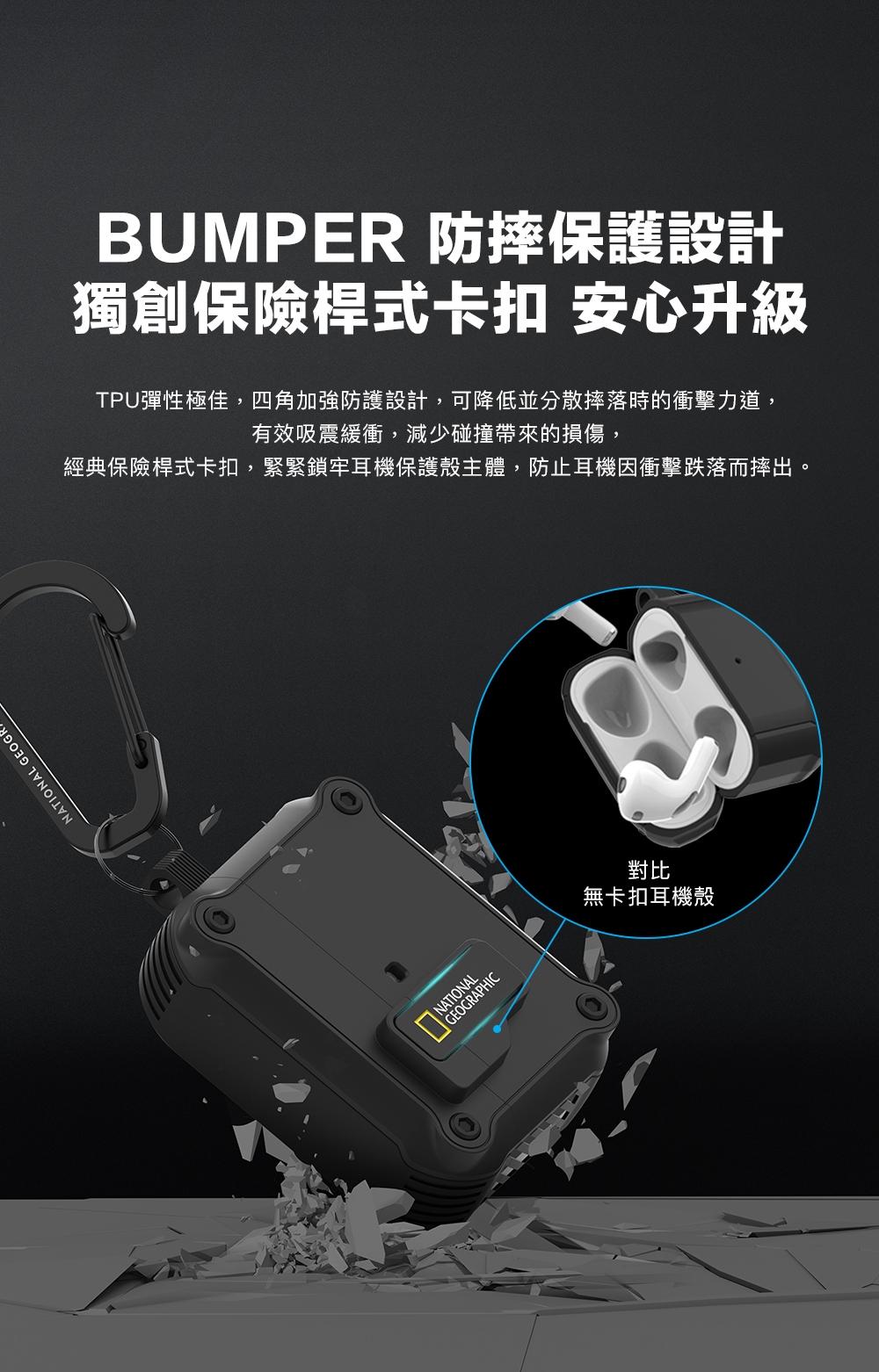 • 獨創保險桿式卡扣安心升級,唯有按壓鎖扣下方才能開蓋,不必擔心耳機丟失