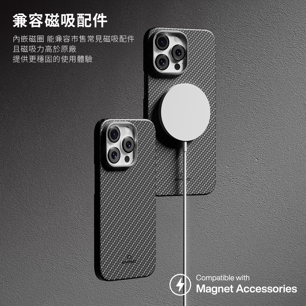 ● 碳纖維內嵌磁圈,支援18W磁吸無線快速充電,以及磁吸手機配件