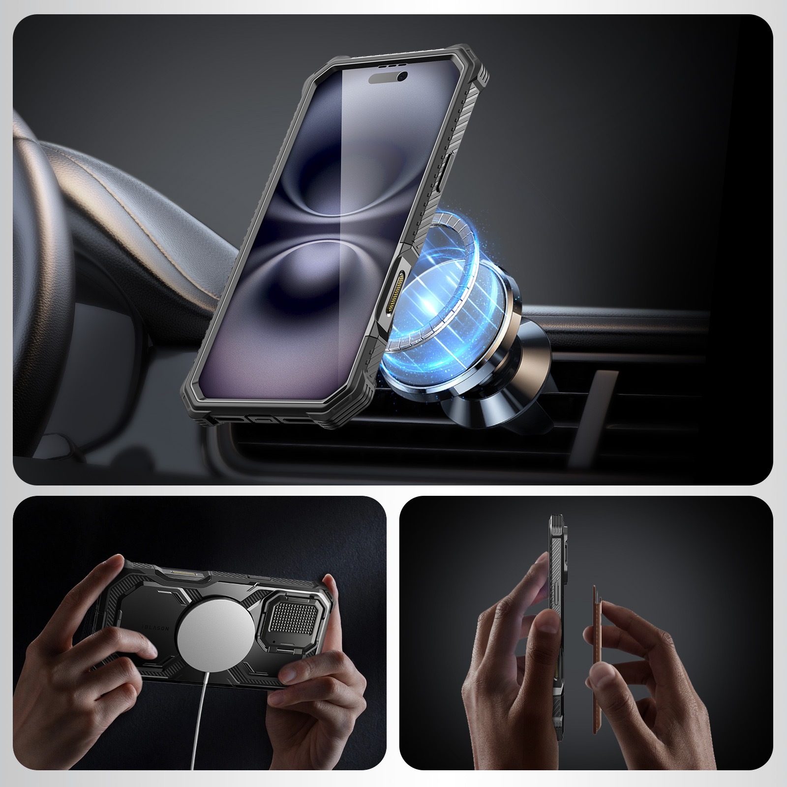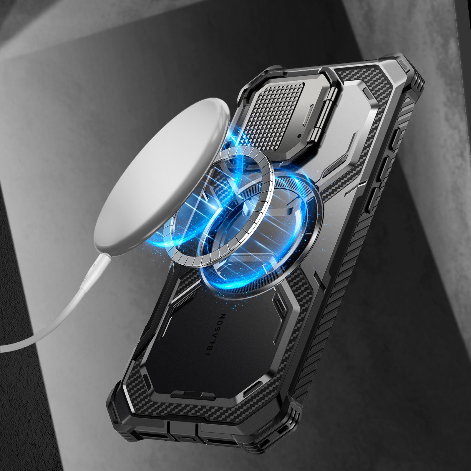 |背板 N52 強力磁鐵,確保 MagSafe 配件緊密吸付磁性支架,並支援無線充電