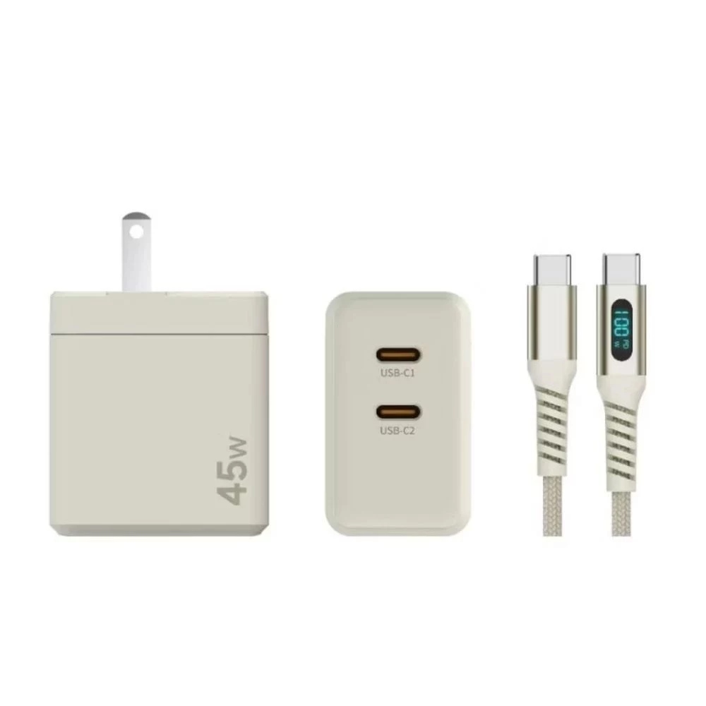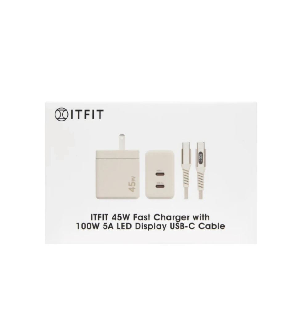 內容物:ITFIT 45W GaN雙孔 電源供應器 *1 、5A 100W Type-C to Type-C LED 快充充電線-1.2M *1、使用說明書