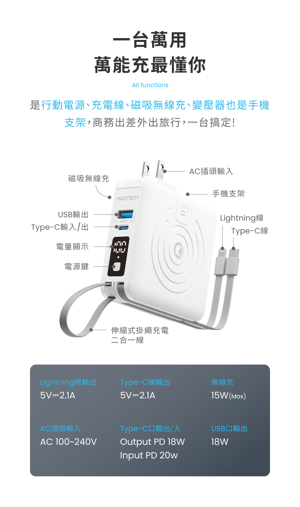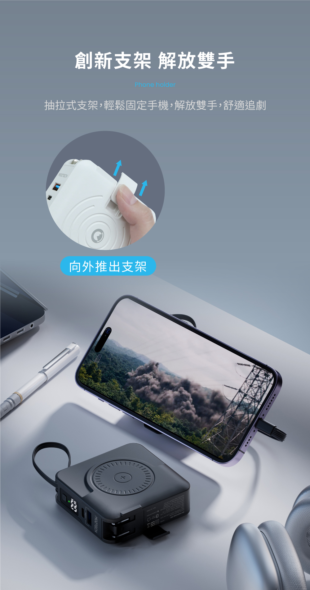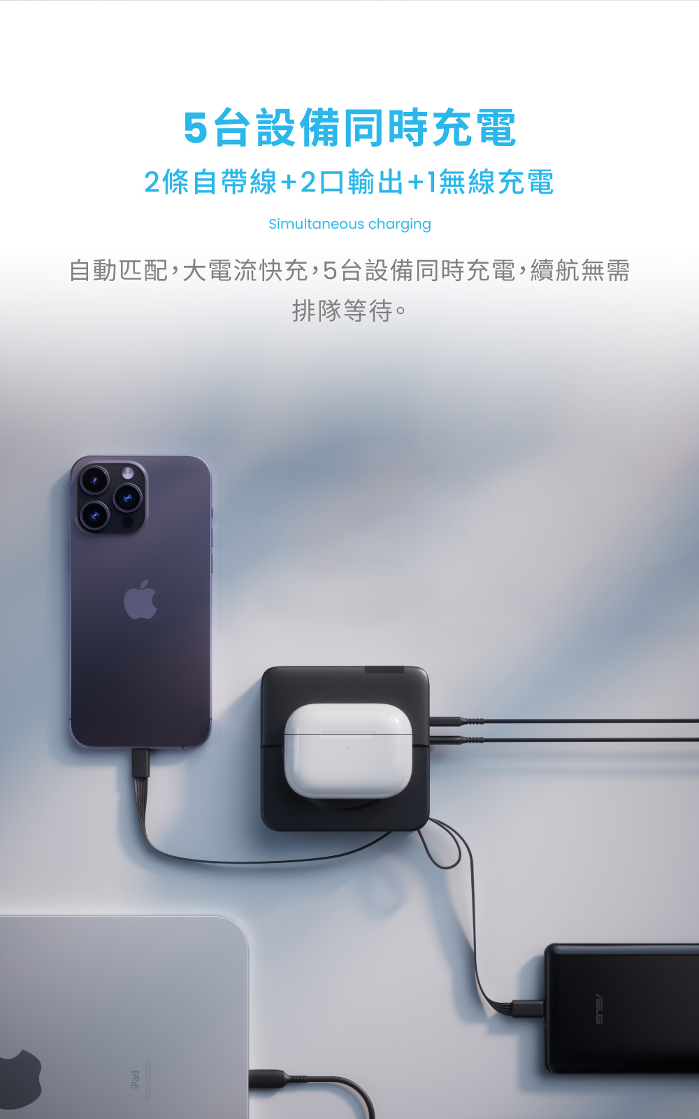 • 自帶充電線 iPhone&TYPE-C 出門一顆搞定!