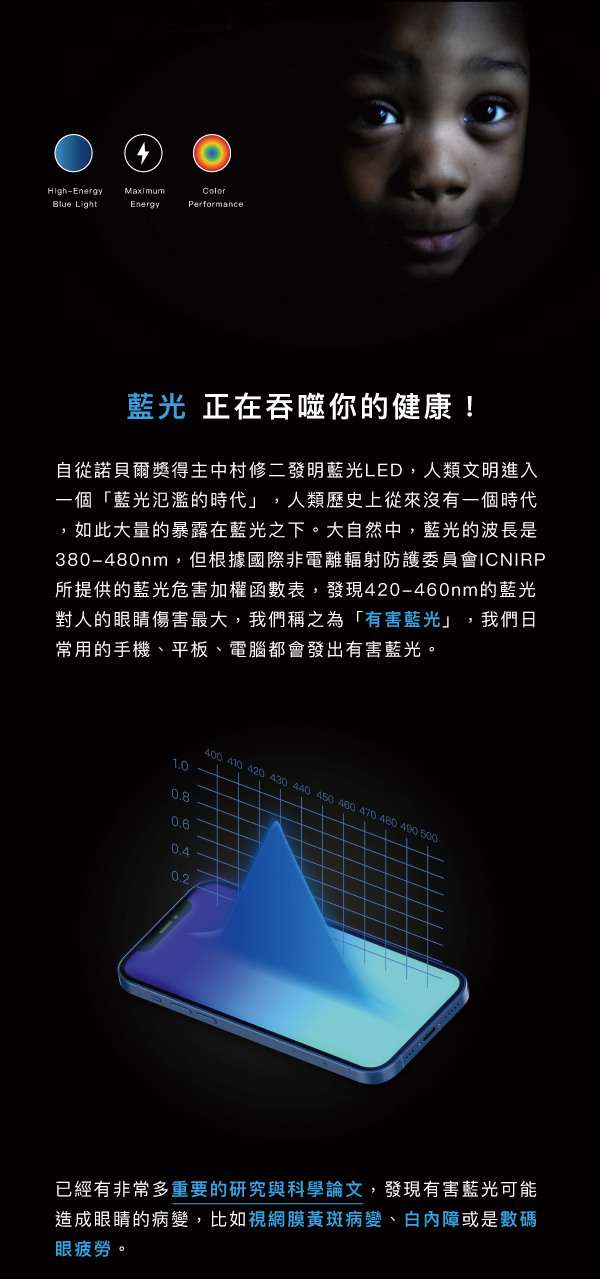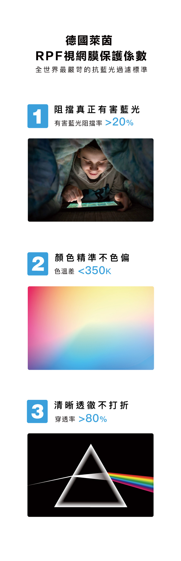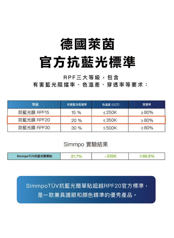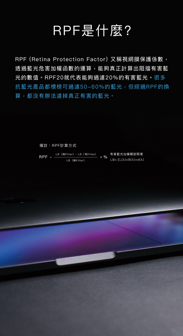 🔳 阻擋真正有害藍光 RPF值20%