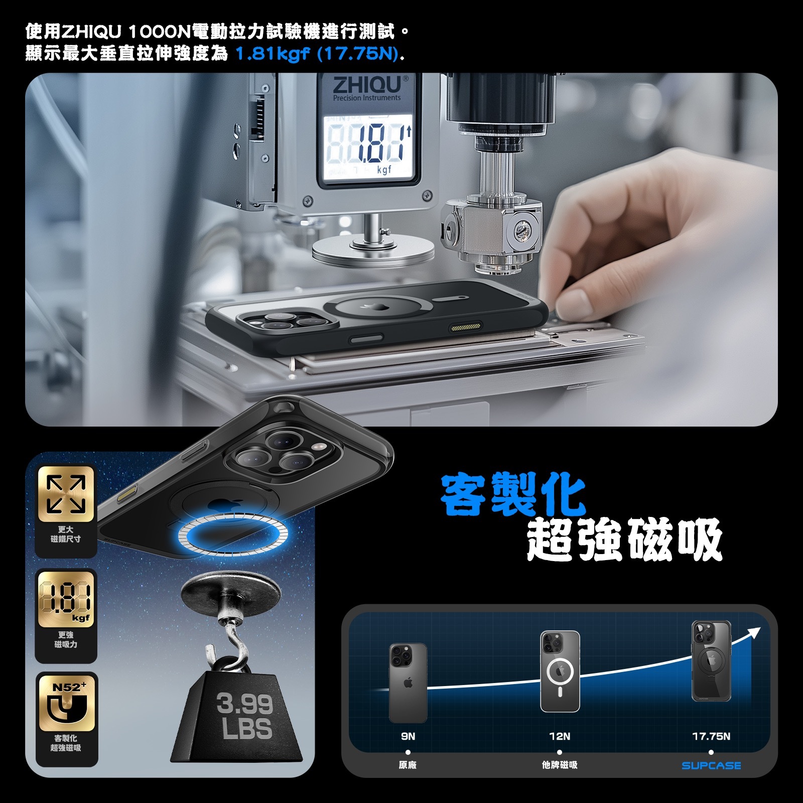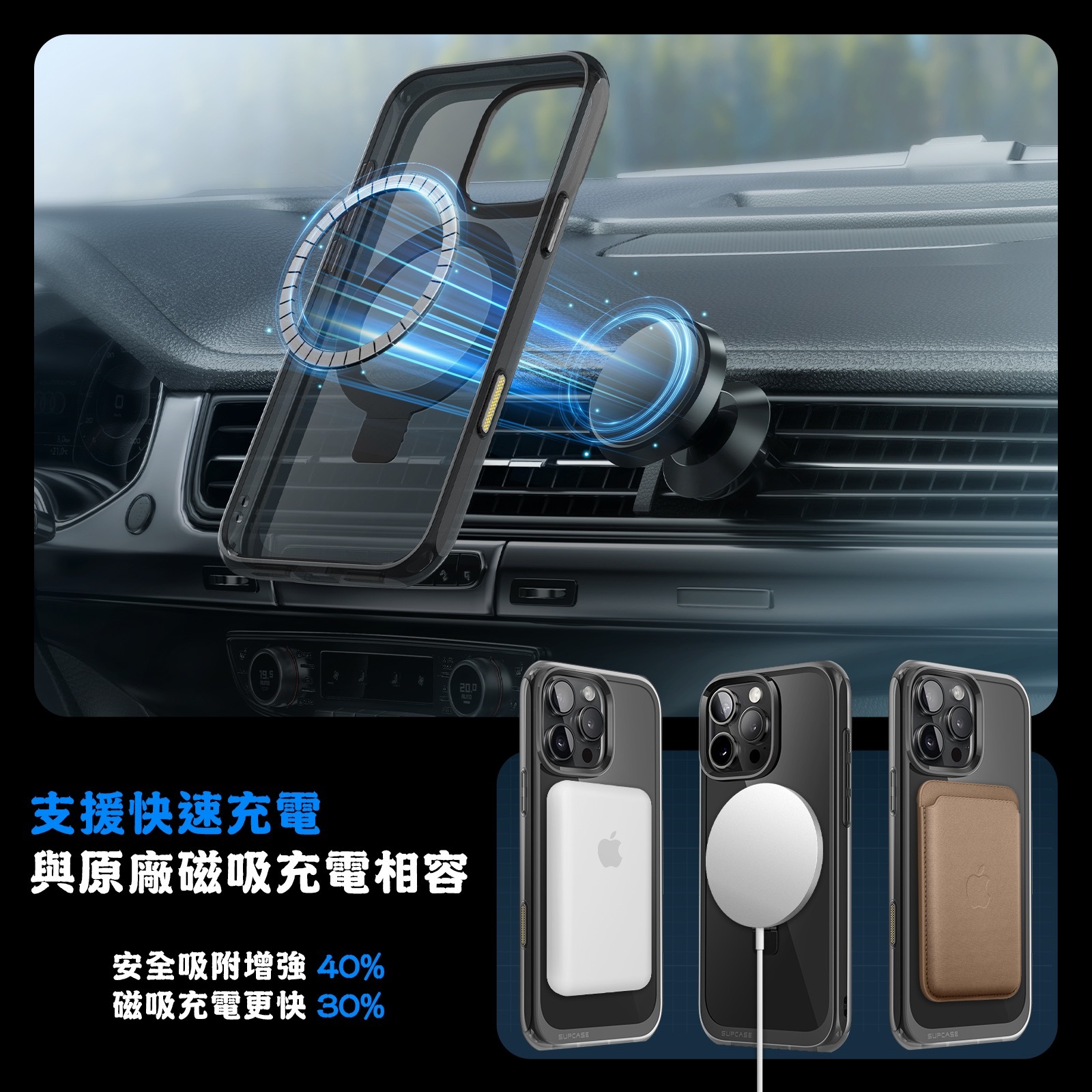 |背板 N52 強力磁鐵,支援 MagSafe 磁吸,確保配件緊密吸付磁性支架,並支援無線充電